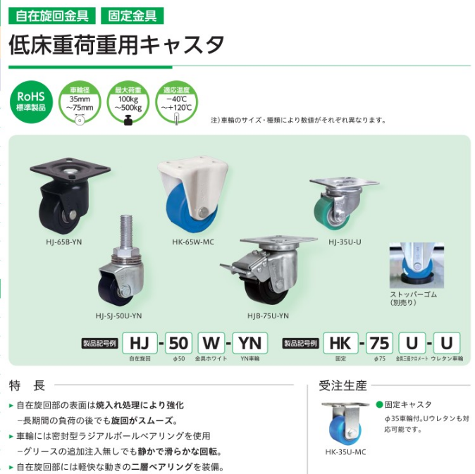 特长;使用的车轮采用“密封型径向轴承”,无需再注入润滑油。金属零件颜色中标准有几种变化,与所使用产品的颜色搭配也很容易。单轮/双轮或高旋转规格等功能方面的变化也很丰富,全部都是标准品。