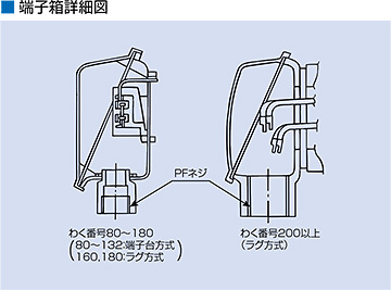 わく番号80~180の端子箱は鋼板製、わく番号200以上は鋳鉄製です。座とふたの間にはパッキンを設け、完全な防塵・防水構造にしています。端子部はわく番号80~132には端子台接続方式を、わく番号160以上にはリード線式圧着端子接続方式を採用しています。また、外部ケーブル引込口は管用平行ねじですから、電線管や電線貫通金物を取付けることができます。